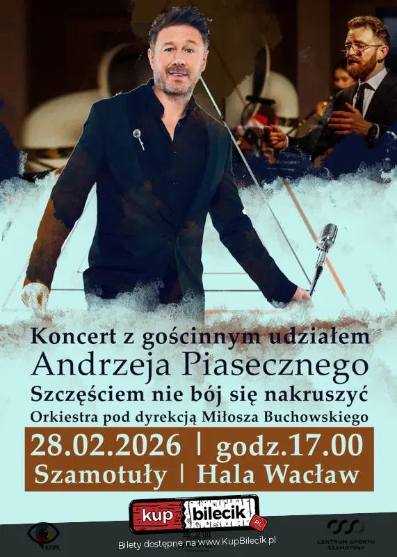 bilety: Serdecznie zapraszamy na koncert Orkiestry pod dyrekcją Miłosza Buchalskiego z gościnnym udziałem Andrzeja Piasecznego "Szczęściem nie bój się naruszyć" Bilety do nabycia na: KupBilecik.plAndrzej Piaseczny artyści: Andrzej PiasecznyZ wykształcenia dyplomowany nauczyciel wychowania muzycznego - studia ukończył w Kielcach w Wyższej Szkole Pedagogicznej. Dziś Andrzej Piaseczny należy do czołówki polskich wokalistów i autorów tekstów specjalizujących się w szeroko pojętej muzyce pop. Charyzmatyczny artysta obdarzony nieprzeciętnym, ciepłym głosem w ciągu kilku lat stał się czołową postacią krajowej sceny muzycznej. Bilety do nabycia na: KupBilecik.pl |