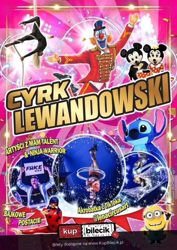 bilety: W programie magia i iluzja w wykonaniu Finalisty Mam Talent, akrobacje w powietrzu na linie pionowej, kole, pasach i trapezie. Na najmłodszych widzów czekają ulubione postacie z bajek m.in. Biedronka, Minionek, tańczące Myszki, oraz Stich. Ponadto Cyrk Lewandowski prezentuje jedyny w Polsce numer kręcenia hula hopami w powietrzu, prezentowany przez półfinalistkę polskiego Mam Talent oraz uczestniczkę hiszpańskiej edycji, artystka znana jest również z TikToka @lenacircusart. Swoimi oryginalnymi repryzami bawić będzie Klaun Pitter - absolwent Państwowej Szkoły Sztuki Cyrkowej w Julinku oraz półfinalista programu Ninja Warrior! Zapraszamy na familijne widowisko Cyrku Lewandowski! * Namiot ogrzewany. Cyrk Lewandowski artyści: Cyrk LewandowskiW programie magia i iluzja w wykonaniu Finalisty Mam Talent, akrobacje w powietrzu na linie pionowej, kole, pasach i trapezie. Na najmłodszych widzów czekają ulubione postacie z bajek m.in. Biedronka, Minionek, tańczące Myszki, oraz Stich. Ponadto Cyrk Lewandowski prezentuje jedyny w Polsce numer kręcenia hula hopami w powietrzu, prezentowany przez półfinalistkę polskiego Mam Talent oraz uczestniczkę hiszpańskiej edycji, artystka znana jest również z TikToka @lenacircusart. Swoimi oryginalnymi repryzami bawić będzie Klaun Pitter - absolwent Państwowej Szkoły Sztuki Cyrkowej w Julinku oraz półfinalista programu Ninja Warrior! Zapraszamy na familijne widowisko Cyrku Lewandowski! Bilety do nabycia na: KupBilecik.pl |